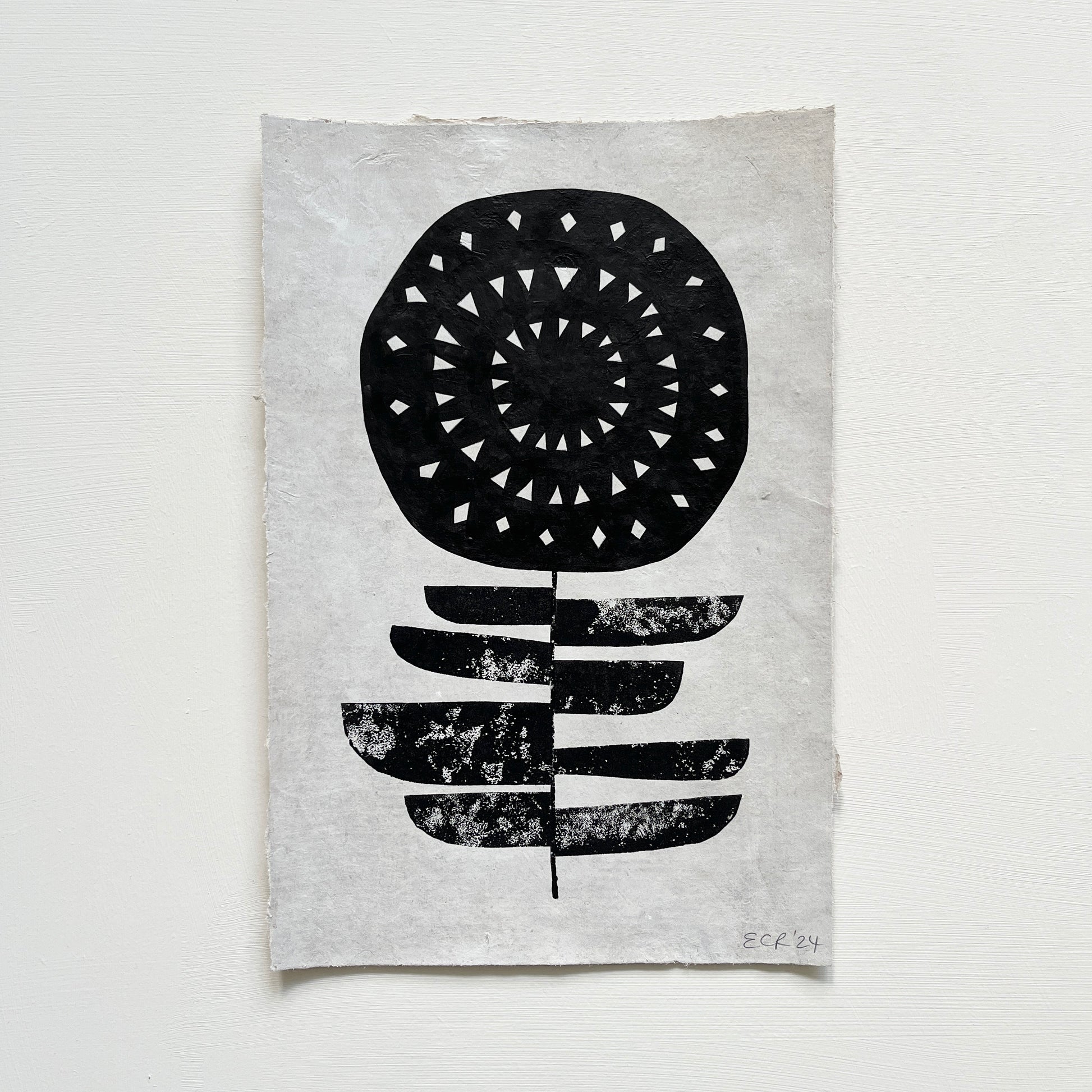 This is an original, one-off print and painting on painted handmade lokta paper from Bhutan. The leaves are individually lino printed with water-based ink. The flower head and line details are painted with acrylic paint.