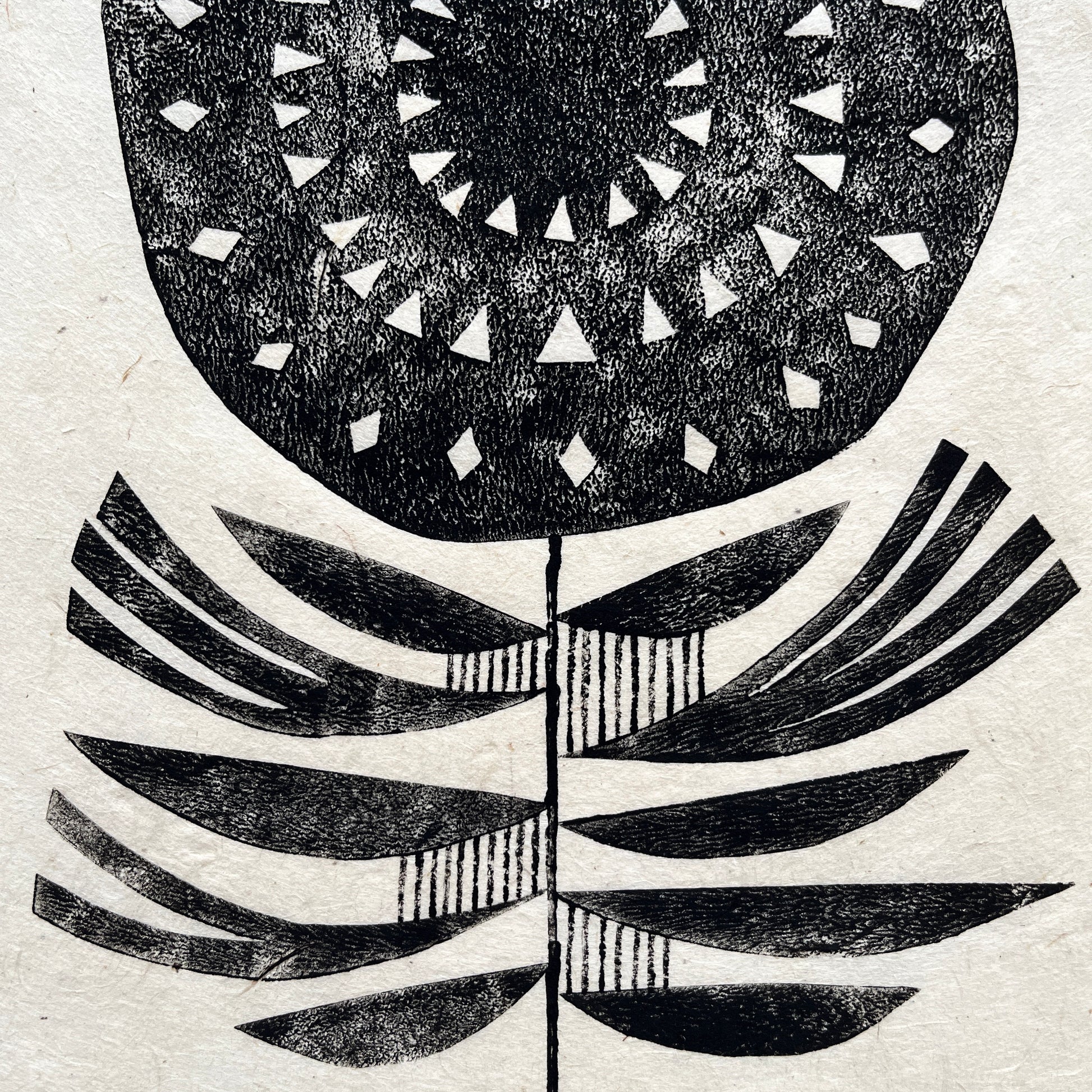 This is an original, one-off print on Nepalese lokta plant fibre paper. Each shape element of the artwork has been individually lino printed with water-based ink, with line details added by hand. No two prints are the same.