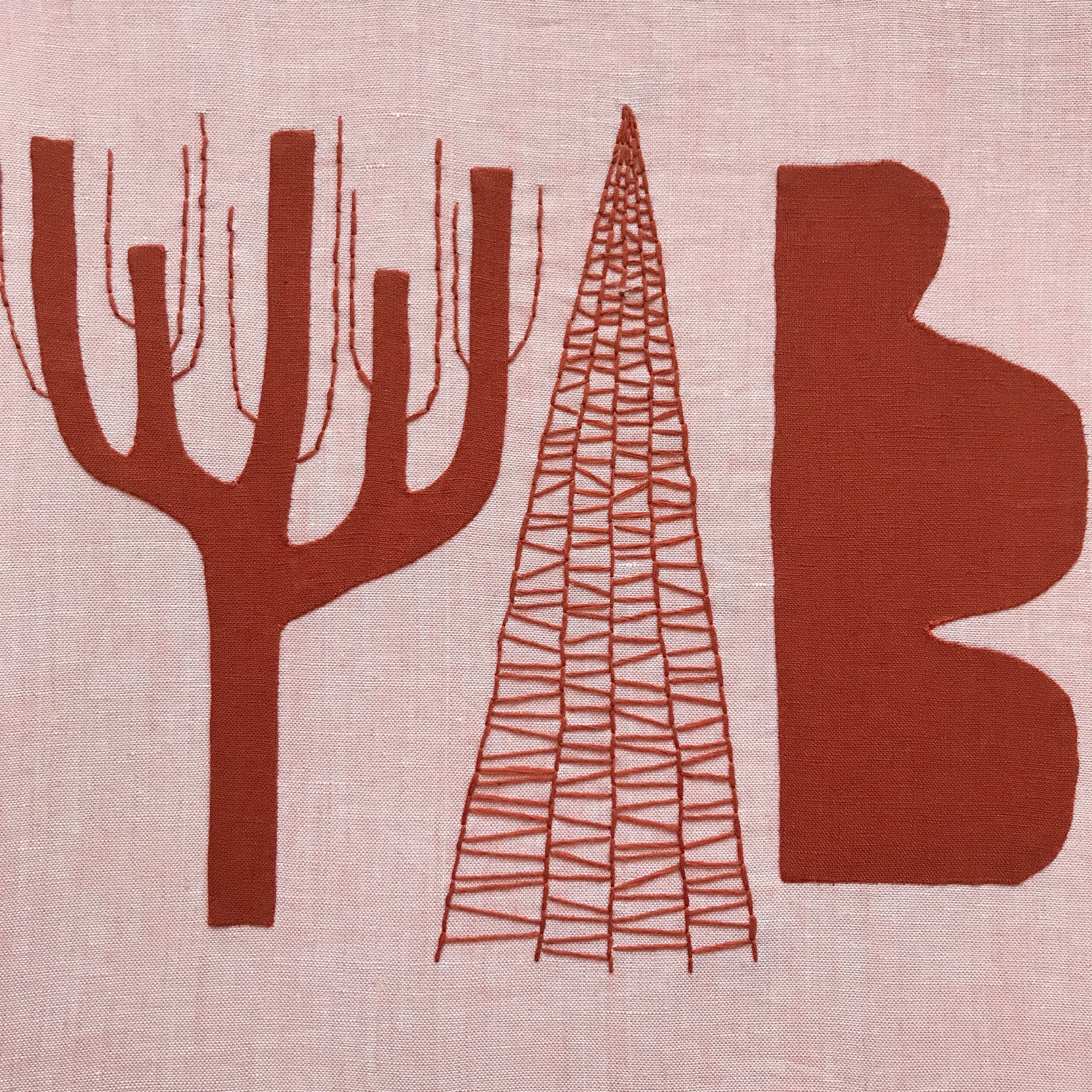 This is a one-off wall panel depicting stylised elements from nature, made from linen and cotton thread. The images have been hand appliquéd and embroidered, and then the fabric stretched over a bespoke wooden frame. The piece can be hung as it is with the addition of simple hanging hardware (D loops and either string or wire), or it can be framed - a tray frame without glass is recommended.