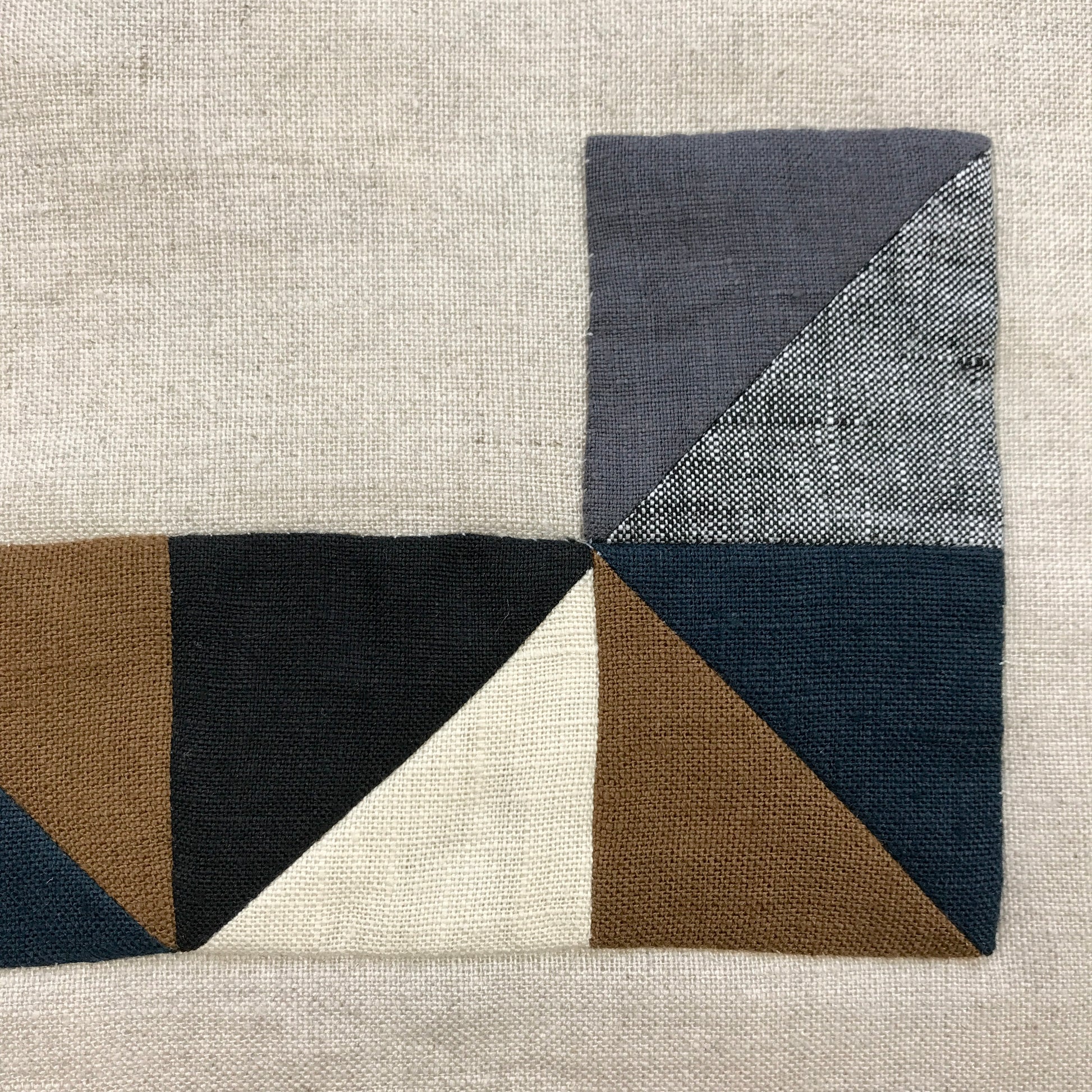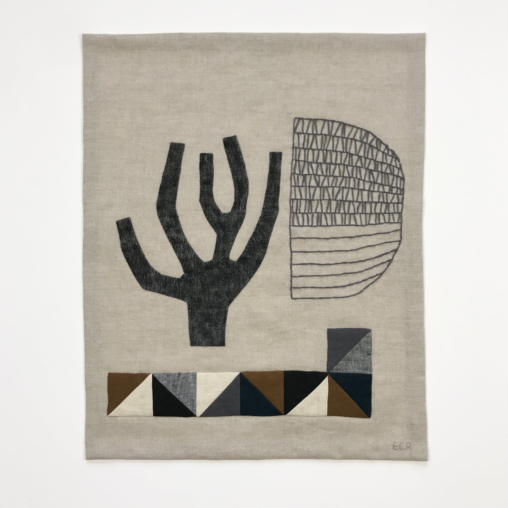 It is a one-off design made from solid and hand painted linens. It employs a variety of techniques including needle turn appliqué, patchwork and embroidery. It is finished with a hand stitched border hem.